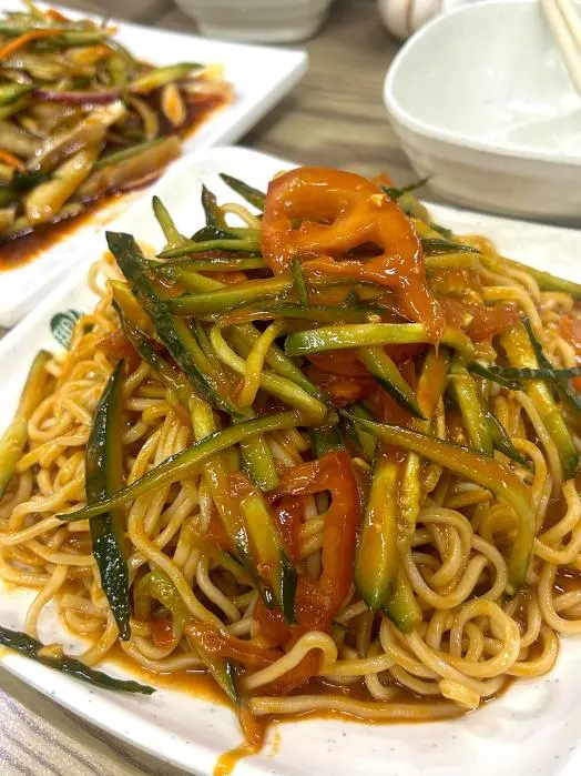 他家的麻汁拌面的汁儿是微微甜丝丝的,配菜还有西红柿🍅,鸡蛋炒面也很不错,很家常的味道。